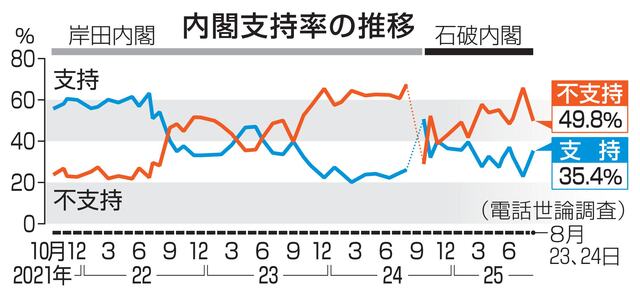 石破内閣の支持率は35.4%で前回から12.5ポイント上昇したが、不支持率は49.8%で依然として上回っている。日米関税交渉を巡る石破政権の対応は「評価する」34.4%、「評価しない」58.7%だった。 自民の次の総裁にふさわしい人を聞いたところ、高市早苗前経済安全保障担当相が24.5%でトップ。小泉進次郎農相が20.1%で続き、石破首相は13.1%で3位にとどまった。